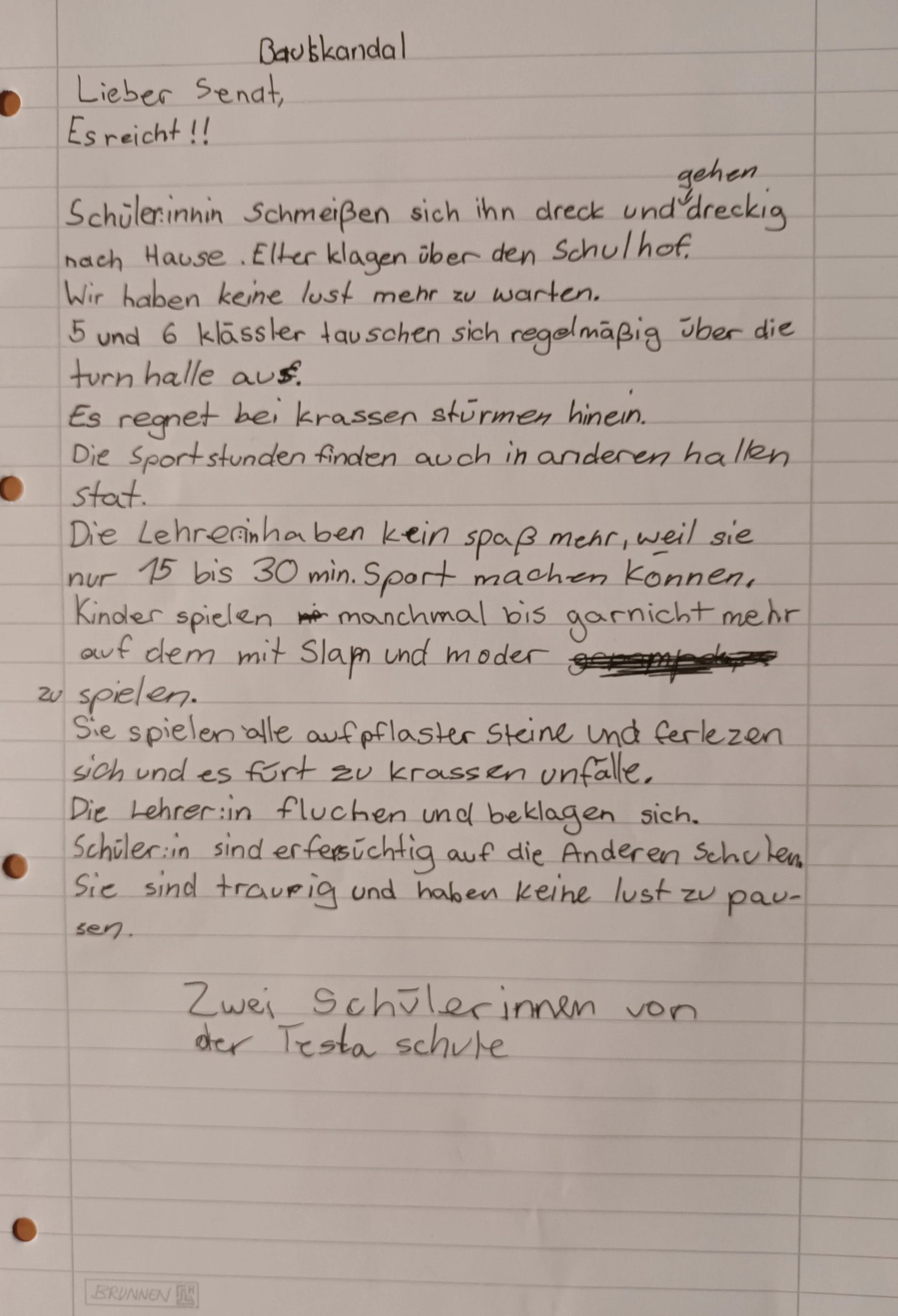 Unsere fünften und sechsten Klassen haben im Rahmen des Wahlpfichtkurses "Medienclub" eigene Protestbriefe an die politischen Verantwortlichen geschrieben. Zwei Briefe als Beispiele finden Sie hier - weitere Aktionen unserer Schülerschaft gegen den Bauskandal auf unserem Campus werden folgen!